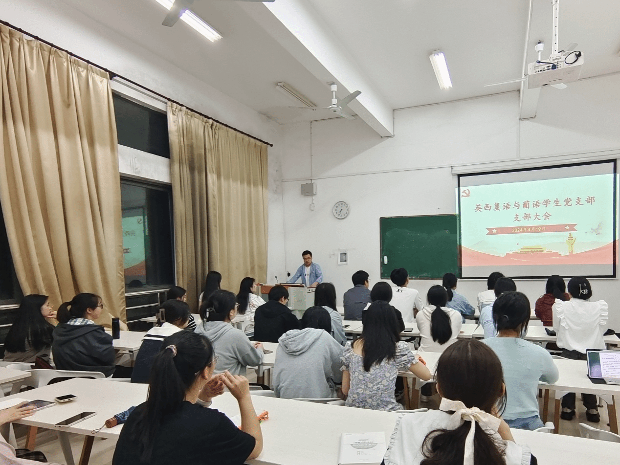 4月19日晚,英西复语与葡语学生党支部在教15-104教室召开支部大会,启动党纪学习教育,开展主题为“坚定理想信念,严守党的纪律”的党纪学习教育主题党日,支部全体党员和入党积极分子参加大会。