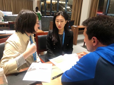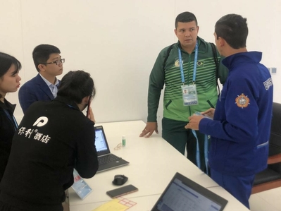 化身翻译“机器”,服务超长“待机”。黄鑫慧同学担任签到会议组的英语翻译,主要负责代表团的接待签到工作,包括与各国代表团团长确认关于欢迎仪式、开幕式、欢迎晚宴以及闭幕式相关细节。同时,她还协助各国运动员了解训练日程、医疗、交通、竞赛日程等信息。每天在12个小时超强度工作时间外,随时提供一些其他必要的翻译服务。