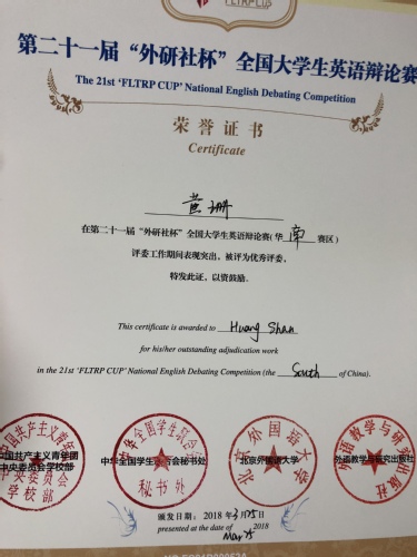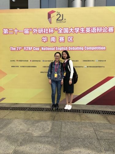 由我院黄珊老师指导的刘嘉玉(14级英语国贸)和童宁(14级英语国贸),在第二十一届“外研社杯”全国英语辩论赛华南赛区98支队伍中突围,荣获二等奖,并晋级全国总决赛。同时,黄珊老师也连续三年获得该赛事“优秀评委”称号。