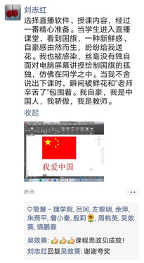 一时间,师生的爱国激情油然而生,直播间被鲜花及“老师辛苦了”等表情字样刷屏。“身为中国人,身为一名教师,我很自豪!”刘志红将此次直播课分享到朋友圈,点赞不断。