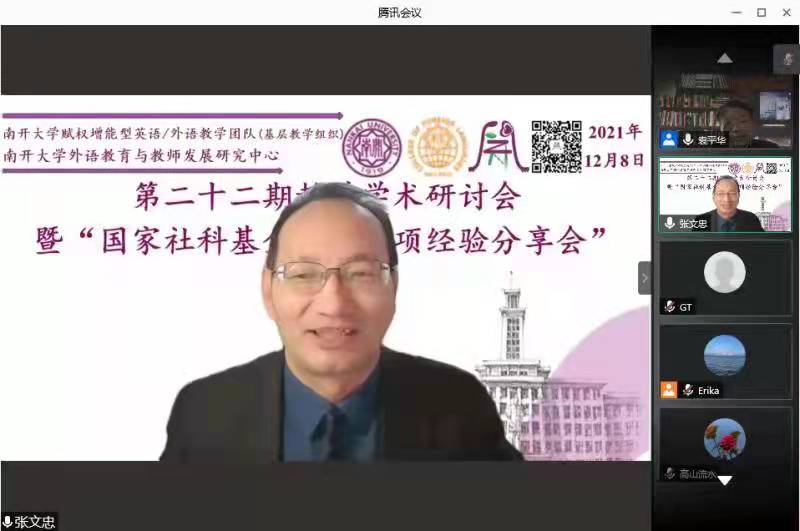 为促进英语专业学科建设、提高教师科研能力,12月19日上午,华东交通大学孔目湖学术沙龙(第八十八期)于线上举行。本次活动以“赋权增能型外语教育理路”为主题,由华东交通大学科学技术发展院主办,华东交通大学外国语学院及院属语言研究所承办。南开大学外国语学院张文忠教授莅临本次学术沙龙,并分享其学术研究成果。本次沙龙由外国语学院副院长袁平华教授主持,学院师生积极参加。