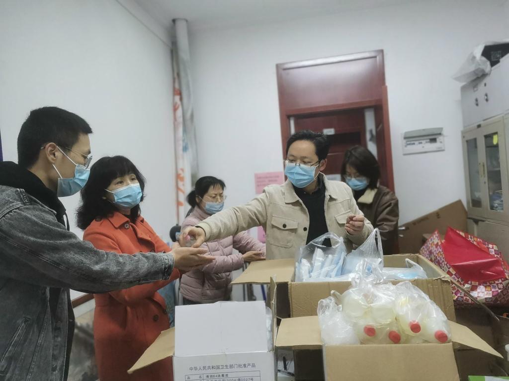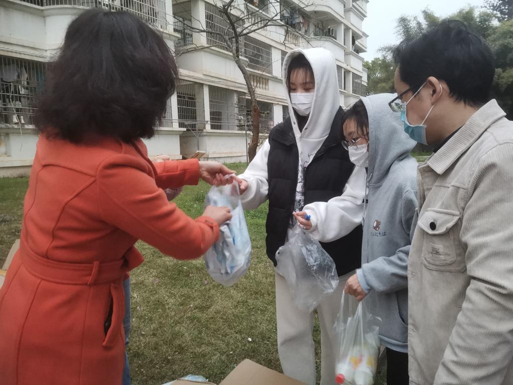 3月20日下午5点,外国语学院副院长单伟红受院党委和院行政的委托,率领在校教师党员谭涛、刘春莲、龚沁怡和学生党员谢潇等争当“火车头”做表率,一同深入学生宿舍发放防疫物资。他们将防疫物资仔细清点、消毒,第一时间送到了学生宿舍楼下。每一位老师和志愿者也将自身认真仔细消毒,以此减少病毒传播风险,保障每一位同学的绝对安全。