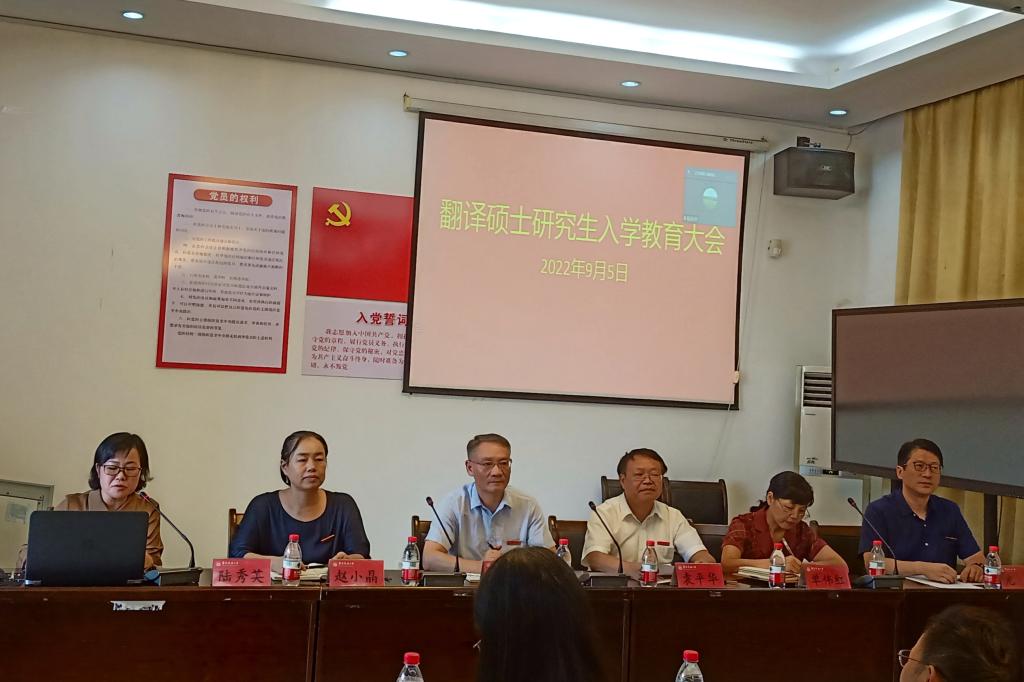 9月5日下午,外国语学院2022级翻译硕士研究生入学教育大会在博雅楼102报告厅顺利举行?;嵋橛陕叫阌⒏痹撼ぶ鞒?,出席会议人员包括全体院领导、相关专业导师及科室负责人、2022级翻译硕士研究生出席会议(含全日制及非全日制)。