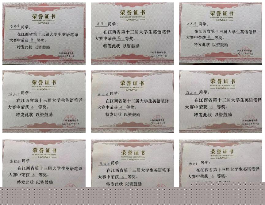 11月13日,江西省第十三届大学生英语笔译大赛在南昌大学落下帷幕。我院学子与来自南昌大学、江西师范大学、江西财经大学等20多所高校共200余名选手(含研究生)同台竞技。我院19级翻译专业本科生黄晓莹荣获一等奖,梁星、王思旖获二等奖,张玉琪、蔡钰玲、薛佳宇、高懿凡、陈泳琪、谢雨晨获三等奖。