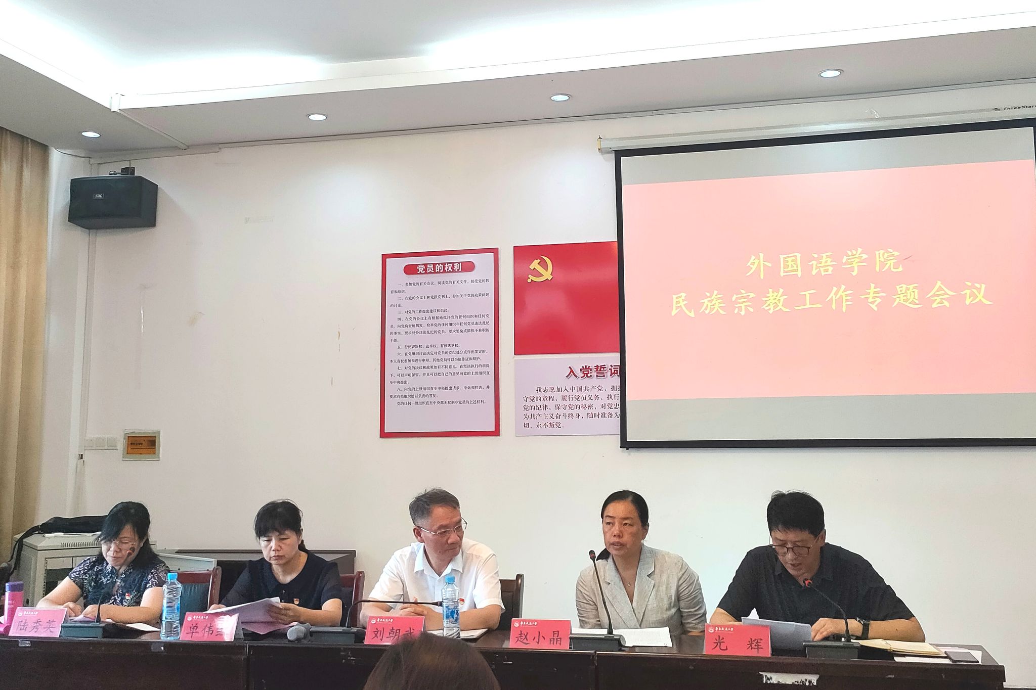 为深入学习贯彻党的二十大精神和习近平总书记关于加强和改进民族工作的重要思想、关于宗教工作的重要论述,2023年6月29日下午,外国语学院召开民族宗教工作专题会议。本次会议由学院党委副书记光辉主持,全院教职工参会。