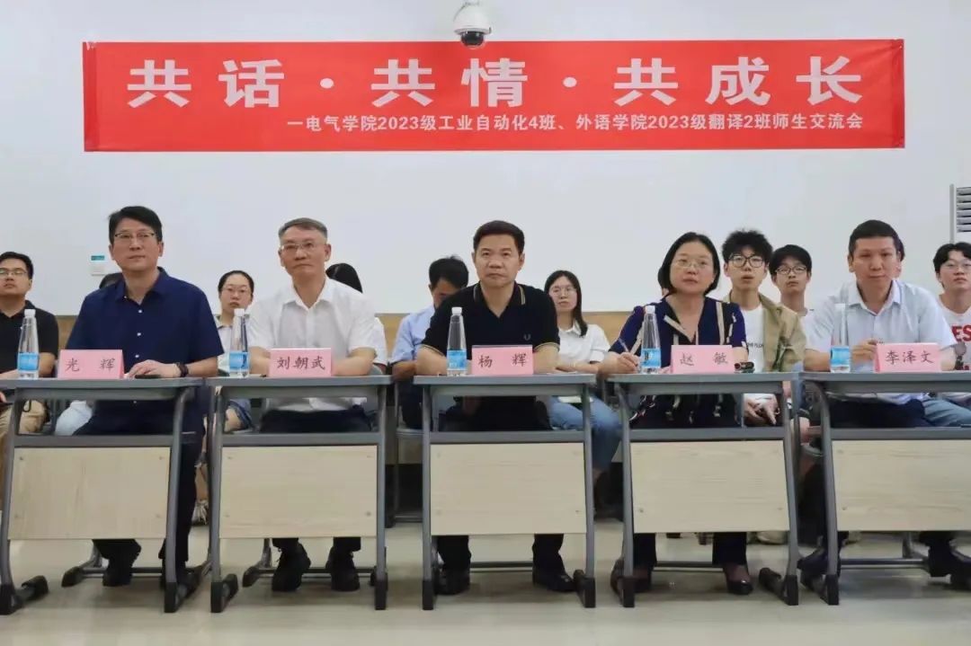 为加强大学生思想政治教育,提升思政育人实效,畅通校领导与学生沟通渠道,了解学生所思所想所盼。6月13日下午,电气学院工业自动化2023-4班、外国语学院翻译2023-2班共同召开“共话·共情·共成长”主题班会。副校长杨辉,电气学院党委书记赵敏、院长李泽文、党委副书记刘修财,外语学院党委书记刘朝武、党委副书记光辉以及学工办负责老师一同参与本次主题班会。