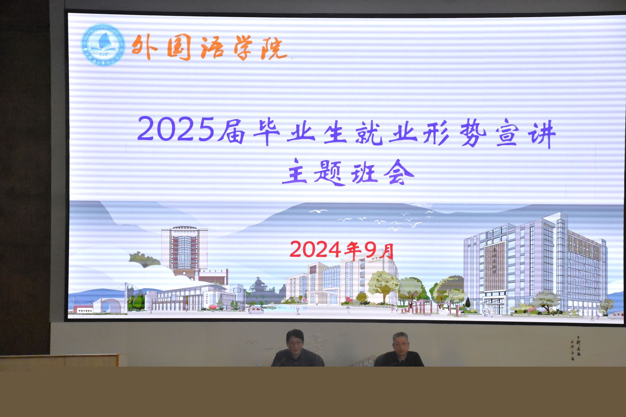 为进一步帮助学生把握就业形势,明晰职业规划,确定职业目标,找准努力方向,9月4日16:30,外国语学院于南区图书馆202召开“2025届毕业生就业形势宣讲”主题班会。本次班会由院党委书记薛先庆主讲,党委副书记光辉、学工办负责人郑伟、2025届毕业生辅导员钟雪倩、王伟峰出席,2025届毕业生及2026届全体同学参加此次会议,本次会议由党委副书记光辉主持。