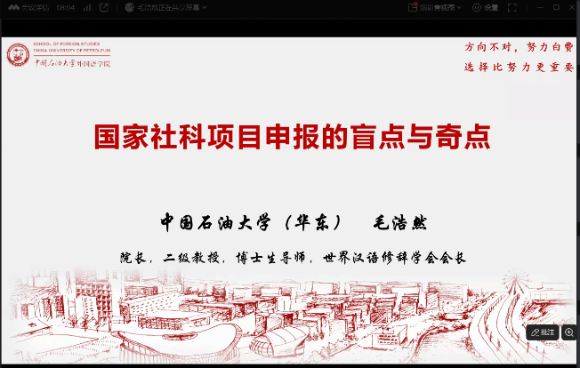2025年1月19日,外国语学院特邀中国石油大学(华东)外国语学院院长毛浩然教授,为学院教师带来一场题为“国家社科项目申报的盲点与奇点”的线上讲座。 毛浩然教授从“国家社科立项的项目分析、申报盲点、申报奇点、选题论证与正反案例、申报结项常见问题解答”五个维度,深入剖析了国家社科项目申报的核心要义。他强调选题的重要性,用“选题是否靠谱,其实占了七八成。方向不对,努力白费”的金句,点明了选题对项目申报成败的关键作用。毛教授还对外国语学院教师提交的2025年国家社科和教育部人文课题意向稿进行了细致点评,从选题、拟解决的问题、研究思路等方面提出了宝贵建议。教师们纷纷表示,此次讲座高屋建瓴、信息量大,为他们开阔了新视野、拓展了新思路,对提升科研能力和学术水平具有重要的指导意义。