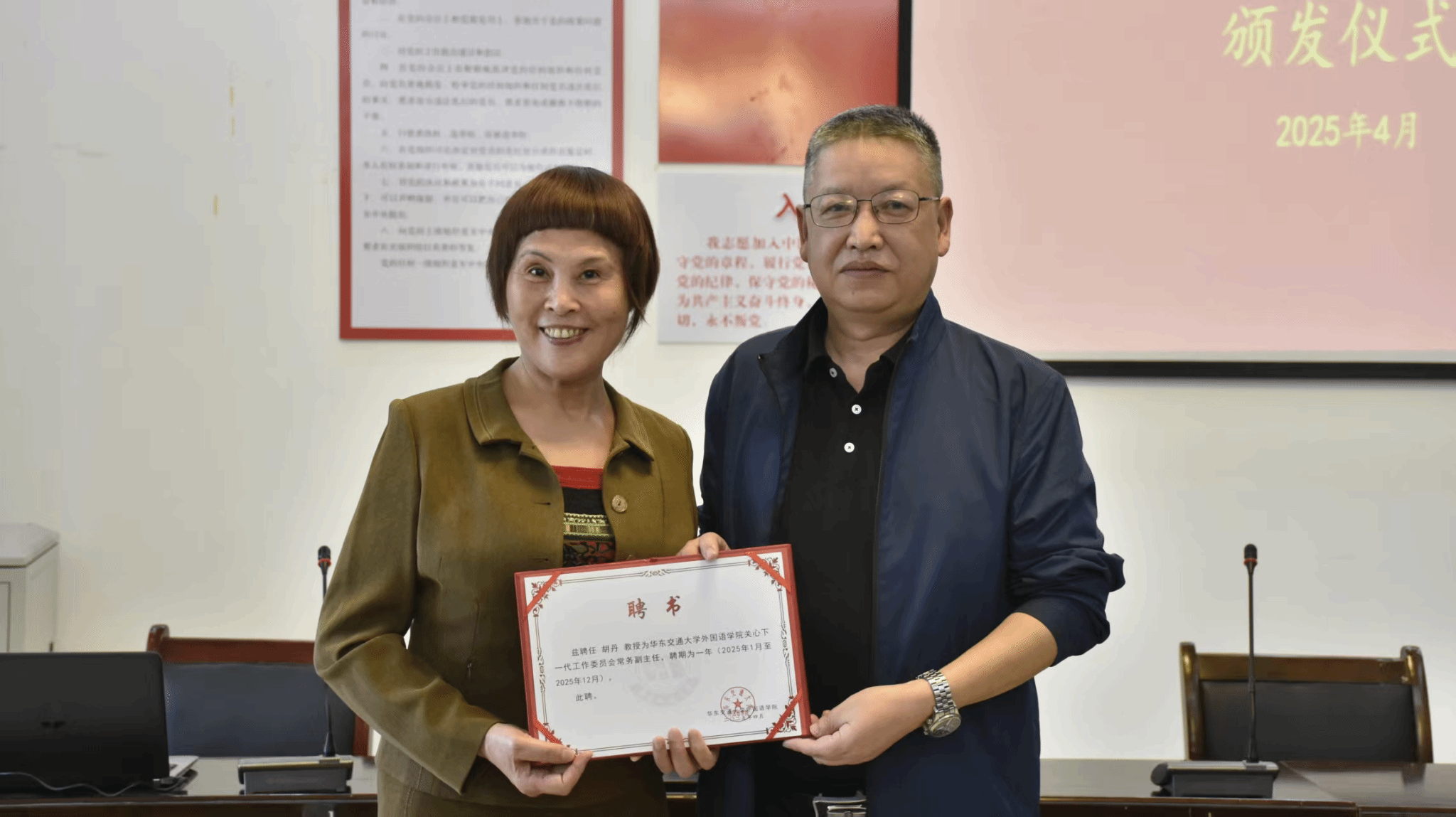 随后,院党委书记薛先庆为胡丹教授颁发外国语学院关工委常务副主任聘书。
